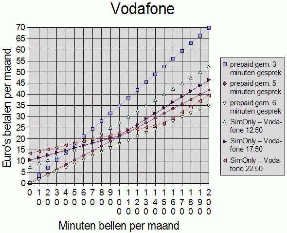 Omdat het Vodafone prepaid tarief zo raar inelkaar zit, heb ik er 3 grafieken voor gemaakt, eentje voor 3 minuten gemiddeld per gesprek of minder (slechtste geval), 5 minuten per gesprek, en 10 minuten per gesprek. Let op, dit zijn gemiddelden.
