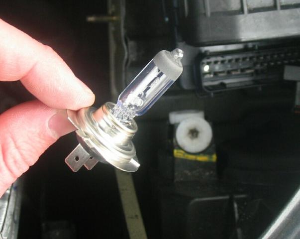 Replace the lamp with a H7 type lamp, again note the orientation of the lamp. Don’t touch the glass with your fingers. Touching the glass will leave grease on the glass. When the lamp heats up, it will become hotter than normal, shortening it’s lifetime. Even worse: the grease will vaporize and leave a non-removable milky deposit on your reflectors. Reflectors are very expensive to replace. The dealer will charge you for a complete headlight unit.