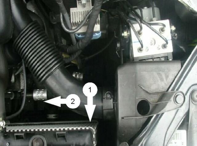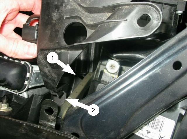 Connect the lamp and make sure it is working. After that, re-install all parts in revers order. Make sure that when you re-install the air intake box, the clips (pointed out by arrows 1 and 2 in the picture) are around the steel rimm. If the air intake box is not correctly placed, the plastic pin will not go through the misaligned holes, and the bottom slot will not align with the thread on which the 10mm nut goes.