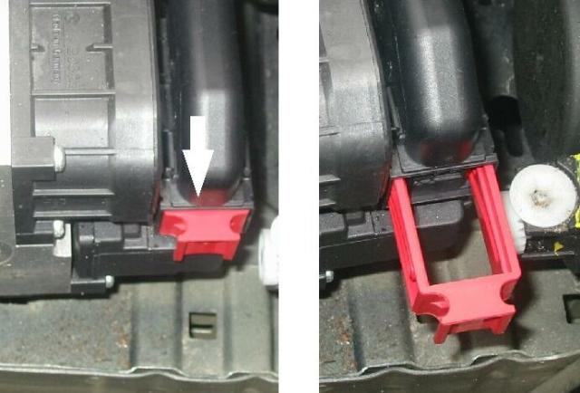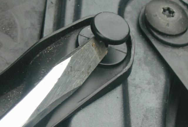 The top of the air intake box is held by a plastic peg. To pull the center pin out, you’ll need to lift the pin with a screwdriver (look carefully at the picture). It should not take much force to take it out, please be carefull with this piece of plastic. I think Citroen will charge a pretty unfair amount of money to replace it should you’ve broken or lost it.