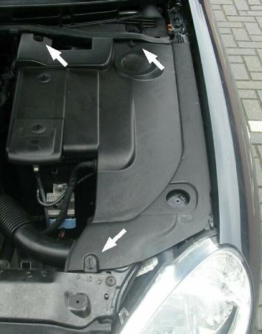 For the left headlight, remove the left engine cover (that’s the right one if you are facing the front bumper ;-). Turn the little knobs 90 degrees counter clockwise and carefully lift up the plastic. The knobs are very flimsy, be careful not to break them.
