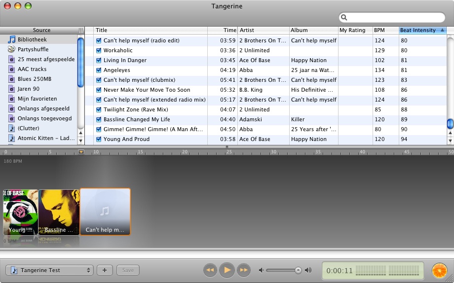 Today I discovered Tangerine, a BPM (Beats Per Minute) analyzer for use with iTunes on a mac. I downloaded it, and it works as advertised. It scans your iTunes music library, and analyzes the BPM (and intensity of the pattern) of each track. It does this in the background, and on my Mac mini Core duo I can continue wih my normal programs while Tangerine analyzes the tracks. The BPM values get saved to your iTunes library, so they will also show up in iTunes if you have the BPM column visible there. The “Intensity” will not be visible in your normal iTunes lists.