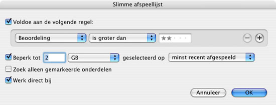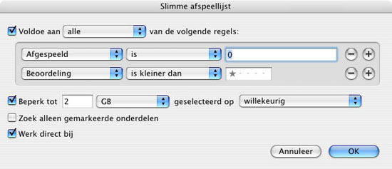 To be able to listen to new songs in your library and rate them, you’ll need a playlist like this one. It’s called “Never played (2GB)” and contains songs I have never heard and never rated. I rate most songs on my iPod, because it’s within reach when listening to music. I use iTunes to stream music to the living room, and I’m not at the screen then so it’s harder to rate songs that way. Nice thing about this list and the rating scheme I use is that 1 or 2 star songs are efectively deleted from my iPod. They don’t show up in the playlists, and during synchronisation they are physically removed from the iPod to never return again.