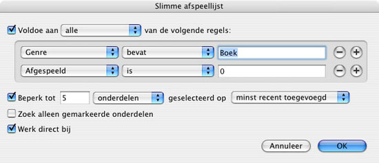 Then there are the audiobooks. I only actually have 1 I think, but this playlist makes sure I listen to my audiobooks in order of purchase. It puts the oldest 5 un”read” books on my iPod. Small disadvantage is that audiobooks need to have their genre set to “Audiobook” for this to work. I haven’t found a trick to select audiobooks based on their extension (m4b) yet. Encoding type could work, but I also have AAC music tracks I bought in the iTunes store so the playlist would contain those aswell.