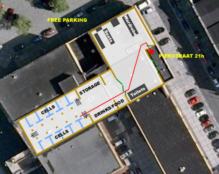 - When at the bar, kindly ask where the toilets are. You will be directed (ordered) through a black door, and you’ll find yourself in the room where the trail was held, and the toilets and wardrobe are. The white doors can be opened from the inside, try the small door next to the wardrobe first. (Follow the red line in the map).