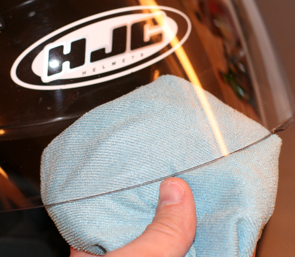 Before applying any product to your visor, you need to carefully clean it. Taking the visor off and washing it with a soft detergent is probably best. On the road this can be a bit more problematic, so you might want to consider taking a damp sponge with you in a watertight bag, and some dry wipes.