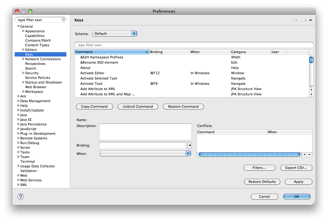 Open Eclipse preferences and go to “General -> keys”. You should see the following settings screen: