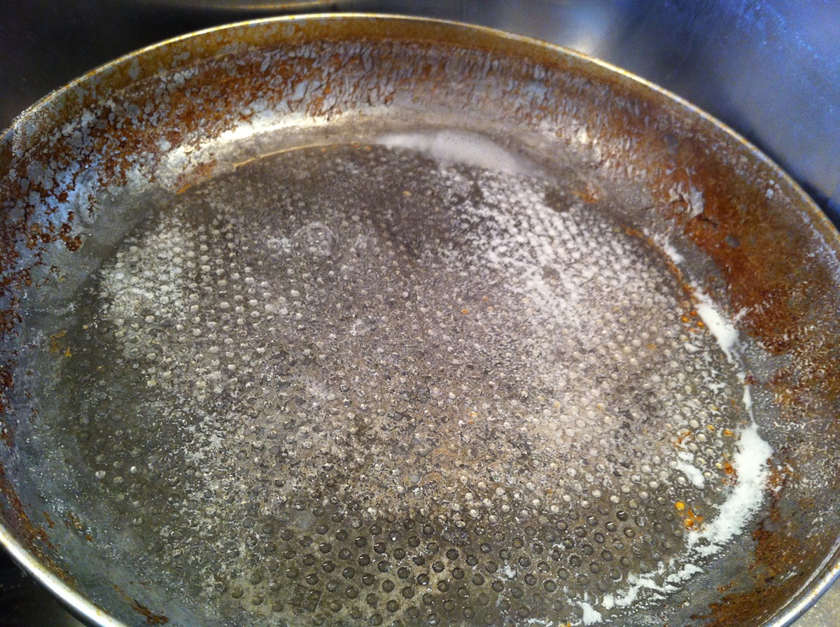 If you leave the pan dirty overnight, the grease will sometimes come off, or it will start to rust. Don’t worry, scrub it and re-season it and you have a new pan.