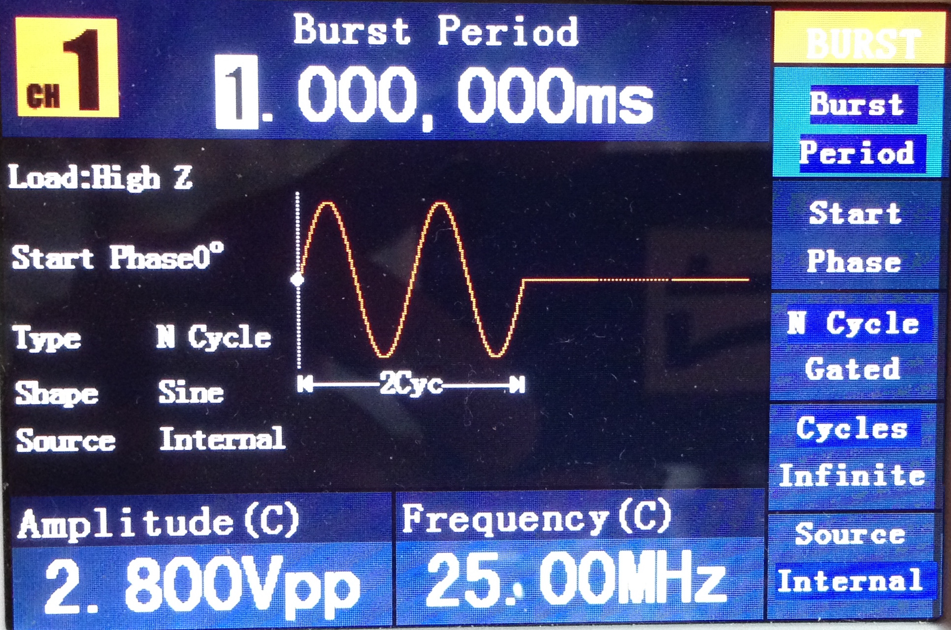 I’m using an OWON AG2052 function generator, and have set it up to generate a “burst”. A 25MHz sinewave, 2 cycles. The voltage is not really important, anywhere from 1 to 5 Volts makes the measurement comfortable, well above the noise floor.