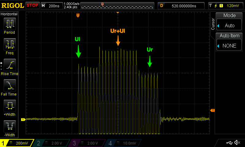 Here, the middle section where \(U_i\) and \(U_r\) are added should not be interpreted in any way. Depending on the length of the cable, and the phase of \(U_r\) you can even see a lower signal here, where \(U_r\) cancels out \(U_i\). Only use the first and last parts of the signal,indicated with \(U_i\) and \(U_r\) above.