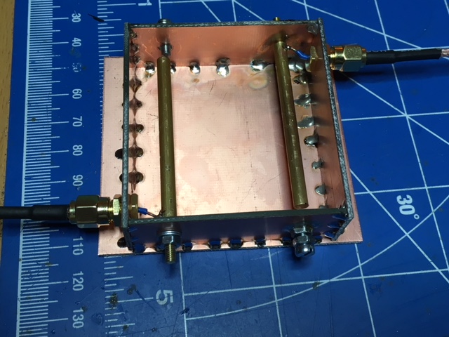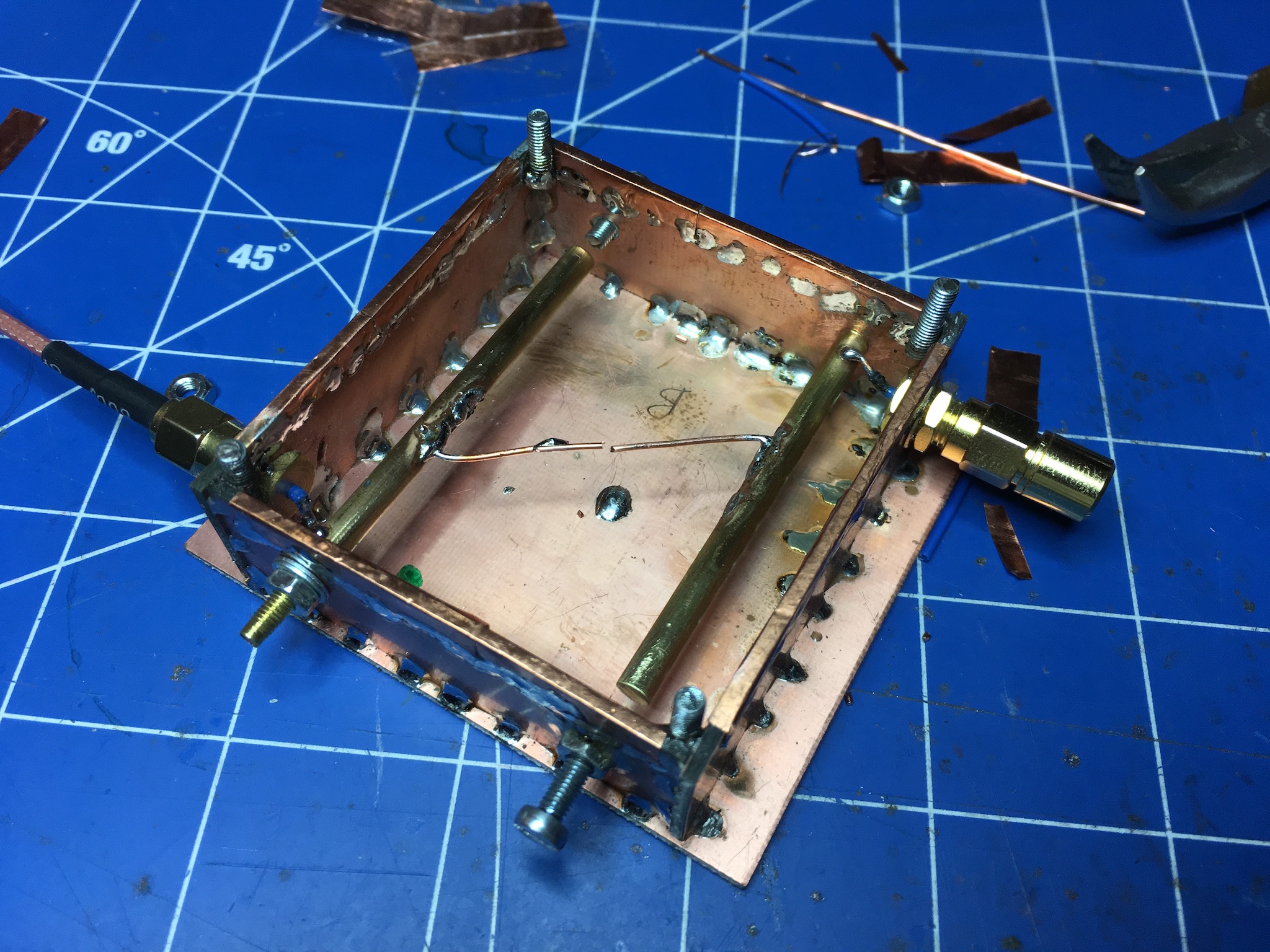 I built the filter with blank PCB sheet and brass rods I had lying around. The first version looked like this: