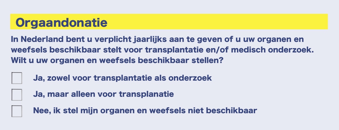 Bij gebrek aan het nieuwe belastingformulier moeten we het voorlopig maar even doen met de online donorregistratie. Zorg ervoor dat je je keuze vastlegt. Dat maakt het voor nabestaanden prettiger, en zorgt ervoor dat de regering die beslissing niet voor jou maakt: