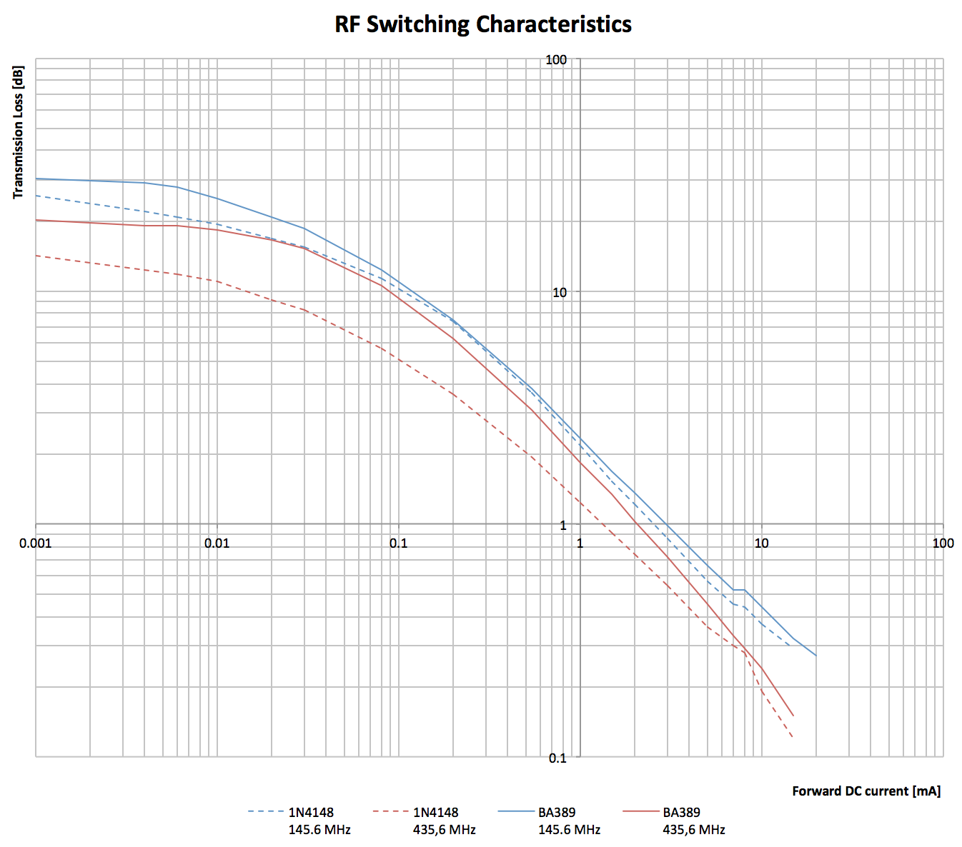 For a recent experiment I was using BA389 PIN diodes to switch low power RF signals. I was asked why I didn’t use an ordinary 1N4148 for that. Since I didn’t know what an 1N4148 would do when used like that, and I also didn’t really know what a BA389 actually does, I decided to do some measurements.