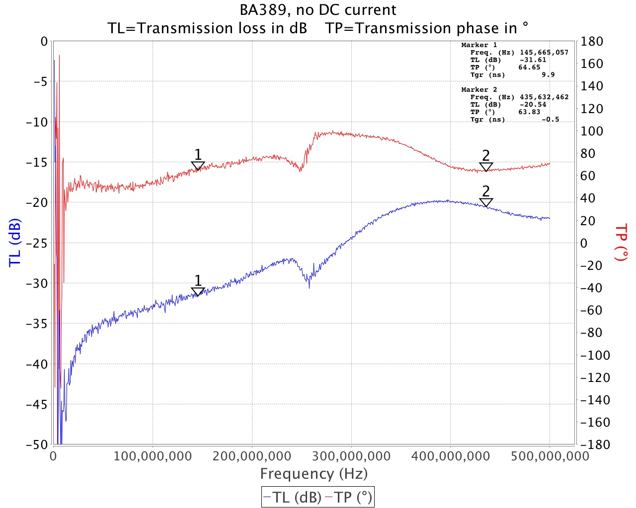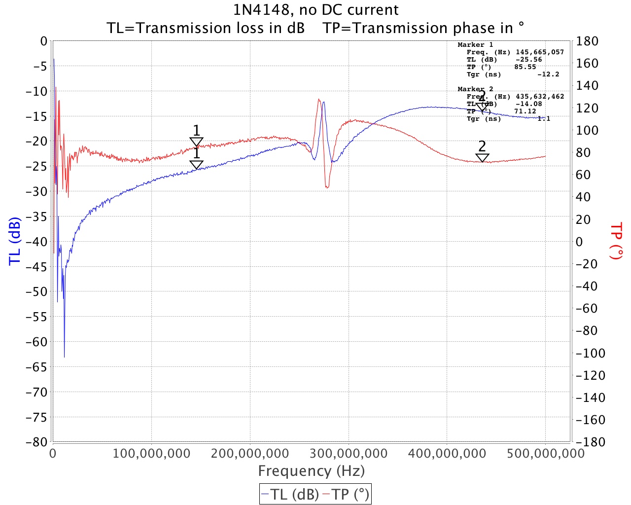 Here are the 1N4148 and the BA389 graphs from the MiniVNA Tiny. The graph for the 1N4148 is an earlier one where I didn’t have the extra shields. The dip in the 200MHz range is caused by the measurement jig itself. Mind the vertical scales, they don’t match. Blue line is Transmission Loss: