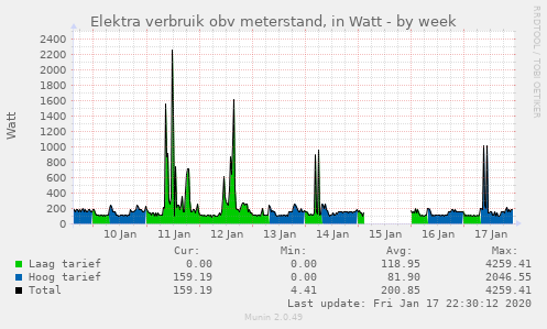A few lines of additional python gave me three separate munin plugins to produce the graphs I wanted. Here is a nice one showing the power usage of last week, split between high and low tariff.