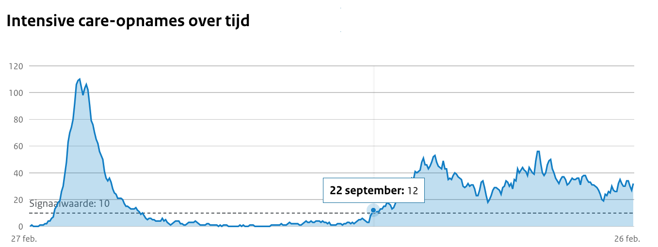 In bovenstaande grafiek zien we dat op 22 september vorig jaar de signaalwaarde van 10 IC opnames per dag overschreden werd. En in de weken daarvoor zagen we dat al oplopen. Wat mij betreft had het beleid en persconferenties voorafgaand aan 22 september simpeler gekund: