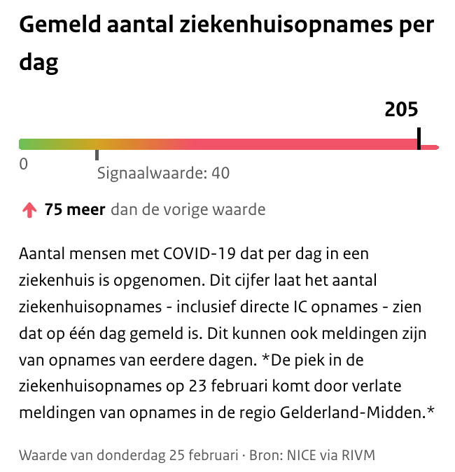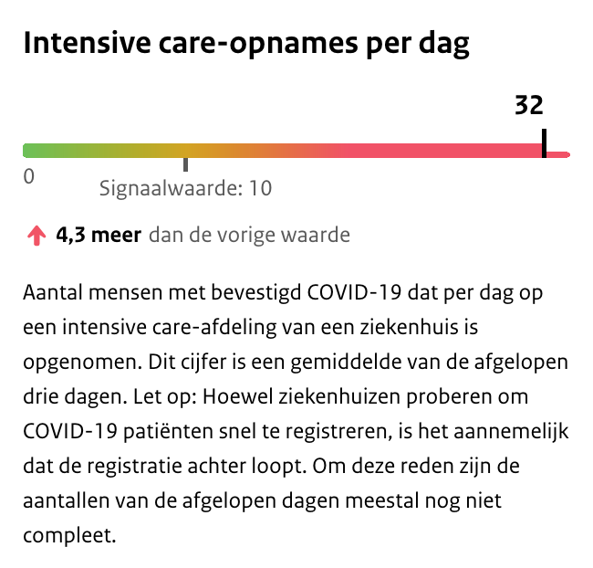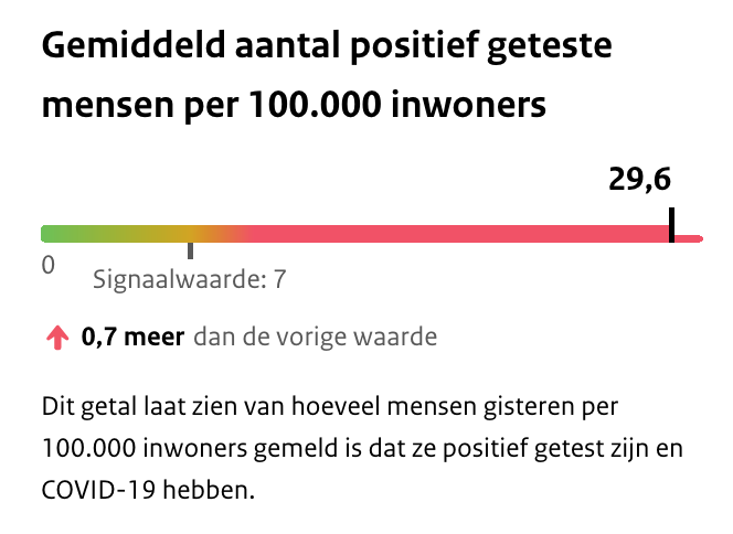 Er is nog iets anders belangrijks waar onze regering wel mee was gestart, maar daarna op pijnlijke wijze heeft laten liggen: Signaalwaarden. Er werd een prachtig dashboard gebouwd, waarin het aantal positieve tests, ziekenhuisopnames en allerlei andere meetgegevens op te zien waren. Aan een aantal van die getallen werden “signaalwaarden” gekoppeld. Voor mij persoonlijk heeft de geloofwaardigheid van onze regering een flinke deuk opgelopen door vervolgens niets met die signaalwaarden te doen. Een voorbeeld van de cijfers en de gruwelijke overschreiding van hun signaalwaarden zie je hieronder: