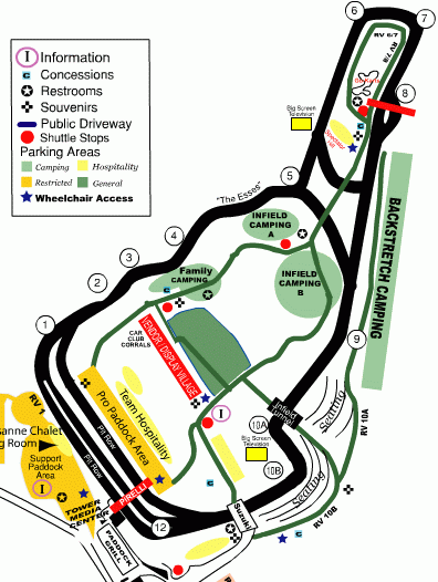 The circuit “Road America”, which is located a few miles north-east of Atlanta, Georgia, has a web-site which shows you a detailed map of the circuit, as well as pointers to the nearest highways. I have grabbed an image (because they only have these stupid noise making flash movie thingied nobody is interersted in after the second visit). It looks like this: