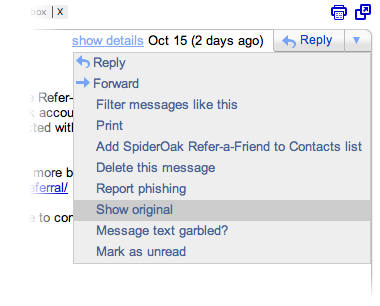 - On the top-right, there is a little triangle next to the “Reply” button. Click that, and select “Show Original”.